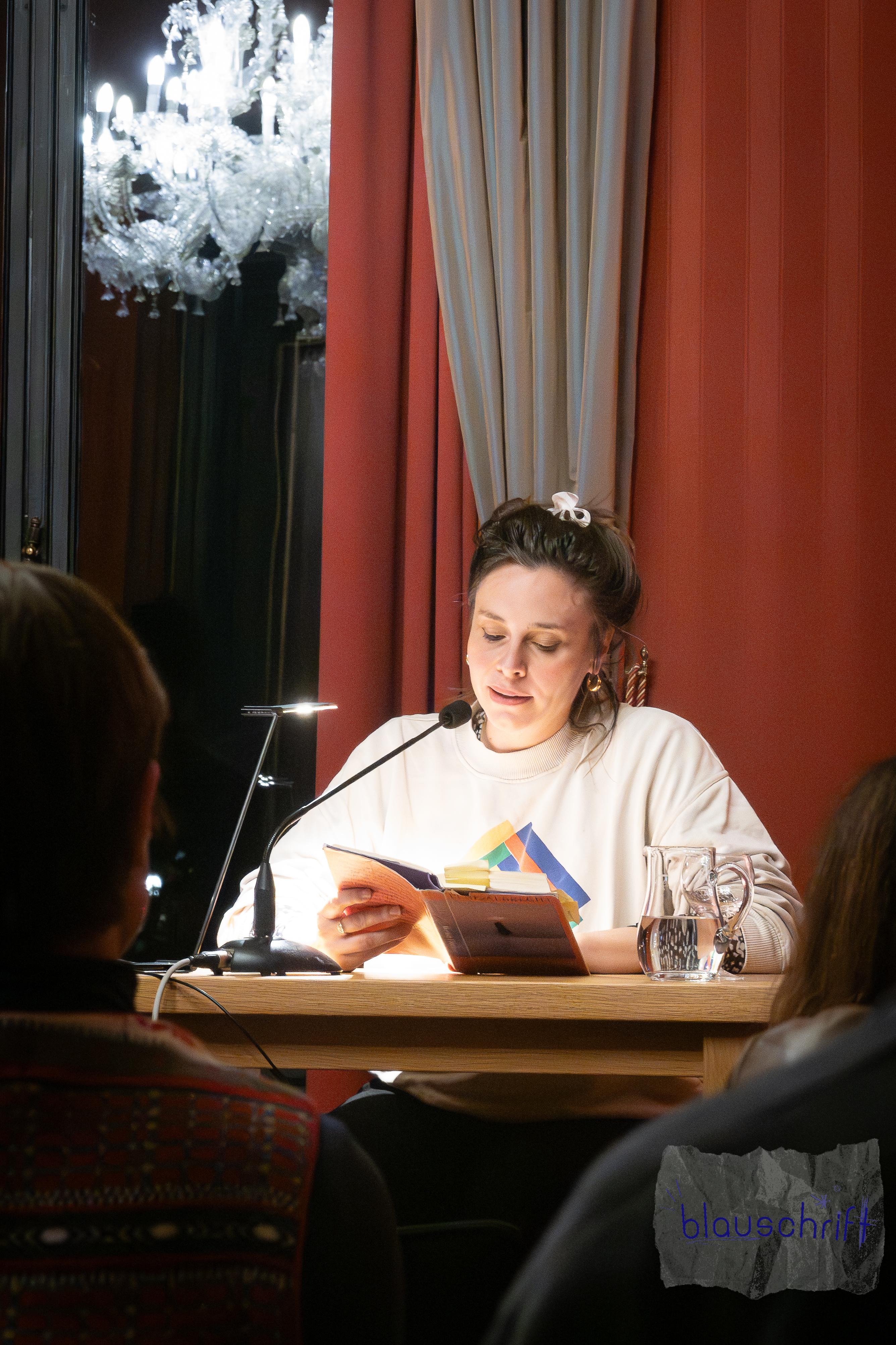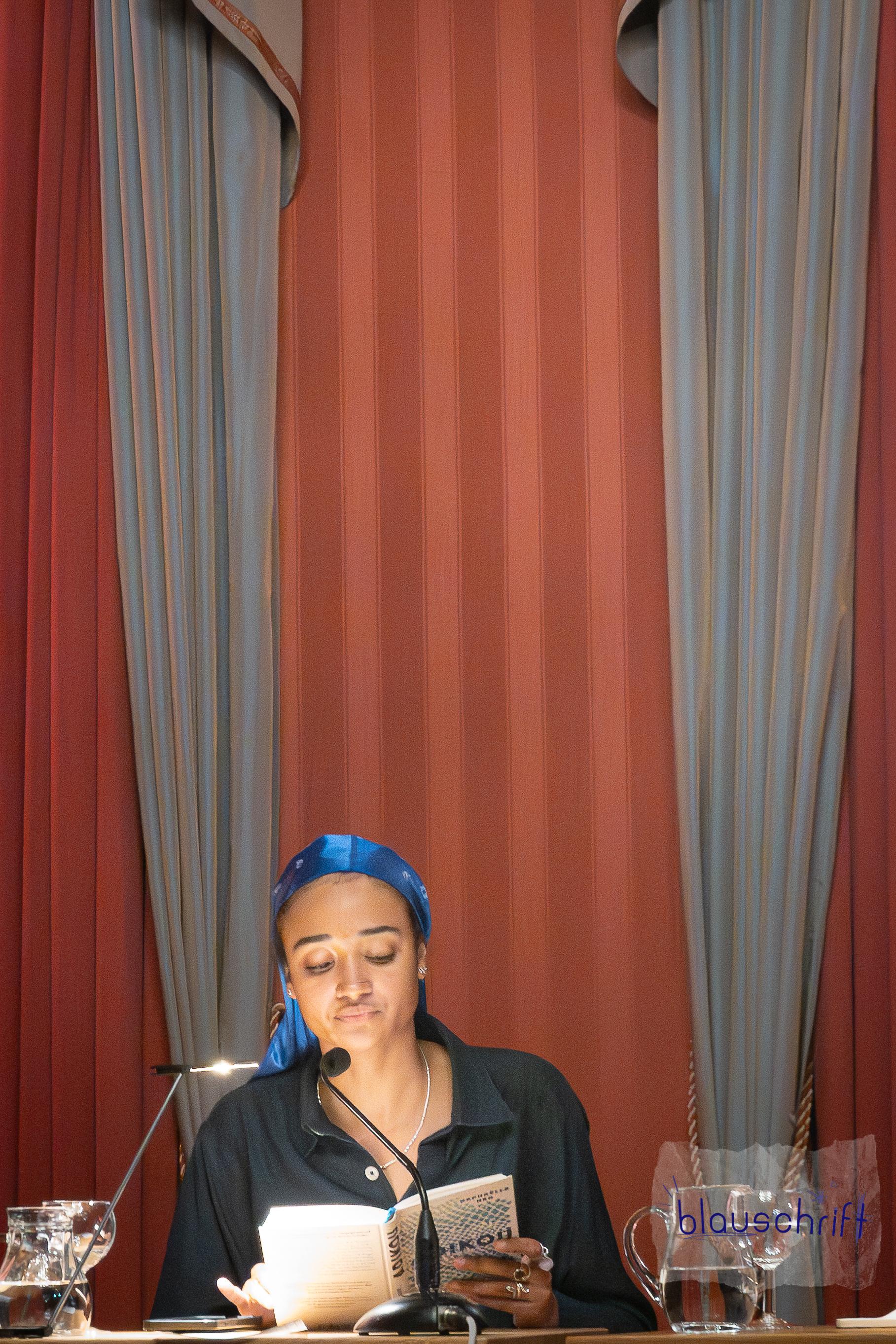 Raphaëlle Red liest aus ihrem Buch, im Hintergrund sind eine imposante rote Tapete und sehr lange hellblaue Vorhänge.